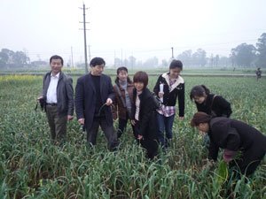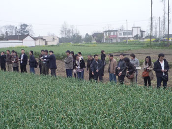3月29日参加农业部公益性行业专项——“葱姜蒜项目”西南生态区“葱姜蒜生产调研与技术对接研讨会”的16名全国专家和成都市农委的有关领导以及10个产业基地县的80余名代表,参观考查了本协作岗位在隆丰镇双埝村的示范基地,蒜农们正在田间采收蒜苔。好多蒜农反映,今年早春持续异常低温,蒜苔延迟上市,“成蒜早”出苔整齐、亩产量可达1000~1200斤,比农家品种700~1000斤增加20~50%,目前田边批发价4元/斤,得抓紧采上市,避免气温陡升引起价格陡降。与会来宾对成蒜早系列品种的早熟性和丰产性和大蒜高产高效生产技术产生的成效给予了高度评价,对“菜-蒜”轮作田块发生的大蒜土传病害的防治办法,少量管叶现象引起的原因给予了现场的指导建议。