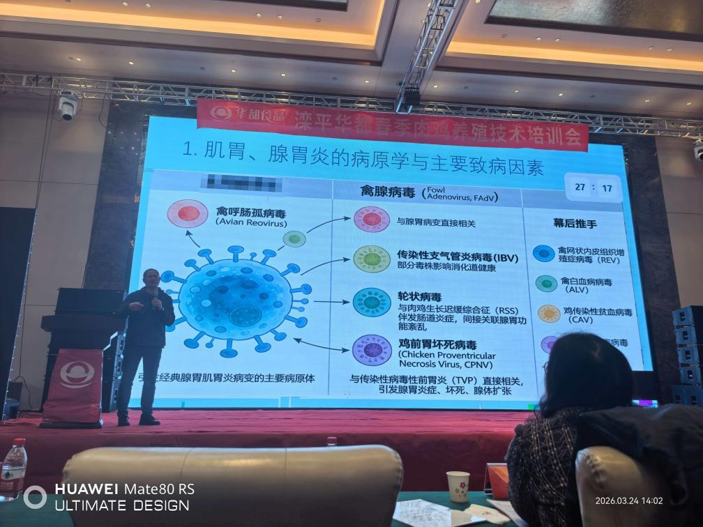 3 月 24 日,春和景明之际,河北承德市滦平县春季肉鸡养殖技术培训会如期举行。由滦平县农业农村局与华都食品有限公司联合主办的此次培训,聚焦春季养殖核心痛点,特邀四川鸡创新团队标准化技术分队成员、四川农业大学动物医学院舒刚副教授授课,为 100 余名肉鸡养殖户带来 “肌胃腺胃炎防治进展” 专题报告,以精准技术指导筑牢产业疫病防控防线,助力当地肉鸡产业高质量发展。