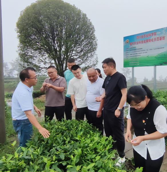 蒲德强与四川省农业科学院植物保护研究所党委书记胡荣平研究员、所长卢代华研究员等专家一行到平昌县金宝街道石庙村与驻村第一书记施彬、村委会何主任、茶叶企业负责人钟超华及其他领导进行座谈交流,并到茶园实地调研指导,蒲德强针对当地茶园小绿叶蝉、害螨、圆赤星病等发生较重的情况,就茶叶病虫识别、生态调控、害虫生物防治技术与高效低毒药剂施用注意事项等进行指导,另外,团队还向石庙村捐赠用于小绿叶蝉、圆赤星病等病虫防治的生物农药和杀菌剂一批。