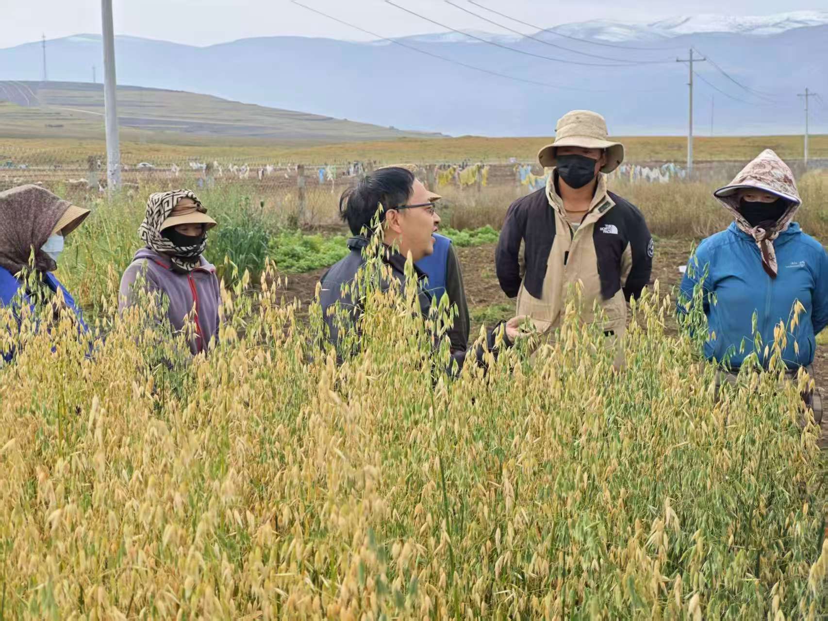 在龙藏乡饲草生产基地,指导10余名农牧民进行饲草燕麦测产及收贮技术培训,包括割草时期、含水量控制、揉丝打碎、乳酸菌剂使用、压实裹包青等环节。岗位专家刘伟介绍了引进的17个饲用燕麦品种的特性及高产栽培技术模式,将高产优质牧草品种推荐给当地农牧民,并将试验示范地饲草免费赠与农牧民。
