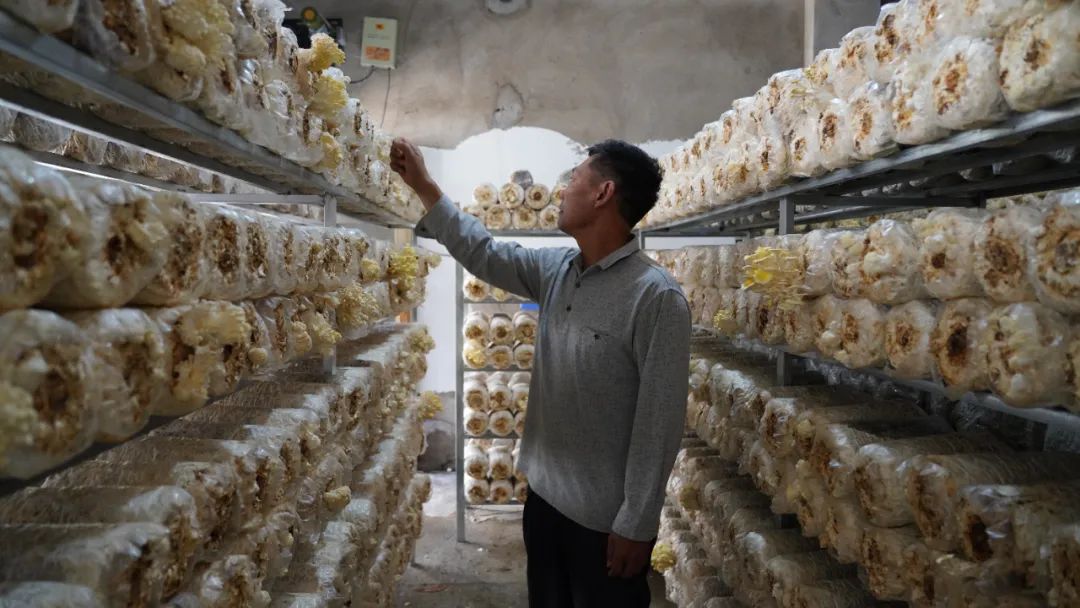 “晚秋这一季,我们家养了20张蚕,现在开始摘茧壳了。有两个养蚕大棚没养蚕子,就用来养菌子了。两个大棚放了40000多个榆黄蘑菌包,现在开始收第一茬菇了,总的产量大概能达到4万公斤,收入应该能有9万多。”养蚕大户骆平说到,脸上洋溢着丰收的喜悦。