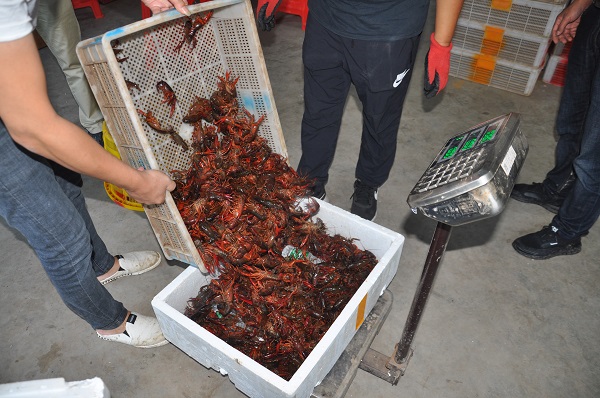 6点过,一辆收虾车开到了泸县玄滩镇海牧专合社门口。“这是今天收到的最后一批龙虾。”海牧专合社负责人高大伦说,“我们基本上5—6点就已经把虾包装好发货。泸县的稻虾在市场上很受欢迎,个儿大又新鲜,全部货运、空运发到成都、重庆、深圳、浙江一带,年平均价格在30元左右,最高时卖到了55元一斤,高峰时期一天的交易量就有15吨。”