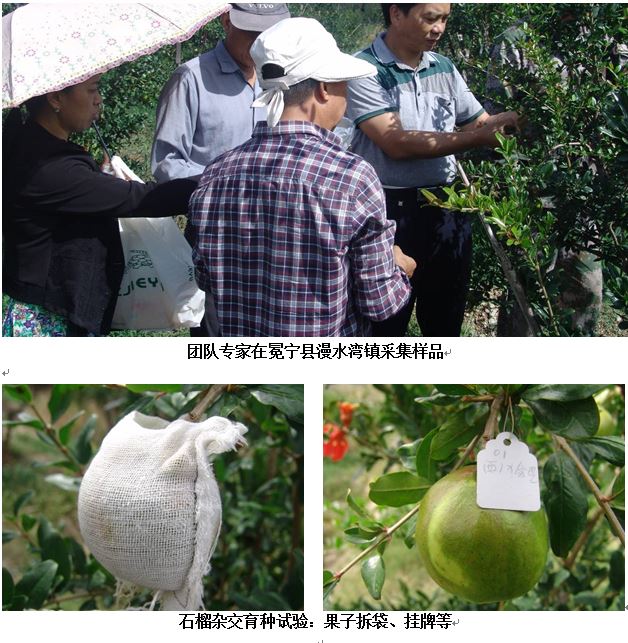 2015年6月7日,石榴新品种引育研究岗位团队前往西昌市中坝乡和冕宁县漫水湾镇采集会理青皮软籽石榴、西昌1号软籽石榴、大叶突尼斯软籽石榴、小叶突尼斯软籽石榴嫩梢,并送四川农业大学小麦研究实验室进行分子生物学检测鉴定。团队2015年在西昌市黄联关镇和中坝乡以“西昌1号”、“大红皮酸”、“以色列酸”、“突尼斯软籽”、“会理青皮软籽”等石榴品种为亲本,开展的石榴杂交育种研究,座果率达41.7%,当前果子大小约150-200g。调查发现,冕宁县漫水湾镇2013年髙接换种的230亩尼斯软籽石榴座果率只有2014年的60%,但中坝乡试点2013年髙接换种的2亩西昌1号软籽石榴座果率高,由于受4月份两次低温冻害影响,预计今年攀西地区石榴相比2014年有所减产。