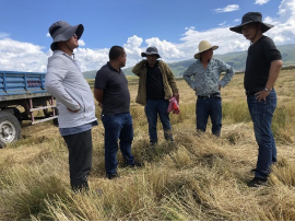 8月17日专家组与当地牧户进行种草养畜的交流,了解饲草生产情况。首席专家李达旭研究员给牧民建议,一是今年的雨水比往年都要少,种子成熟相比往年提前,饲草和种子的收储工作要相比往年提早大约10天,种植户应当注意天气变化,尽早收割饲草和种子。二是由于降雨量减少,饲草产量不如往年,专家提醒牧民要尽早储备一些牛羊冬季的饲草饲料,减少掉膘和死亡。最后,专家组为牧民赠送了梦龙燕麦种子并讲解栽培利用的方法,该品种是项目组新选育的优质高产的一年生饲草品种,适合卧圈种草。