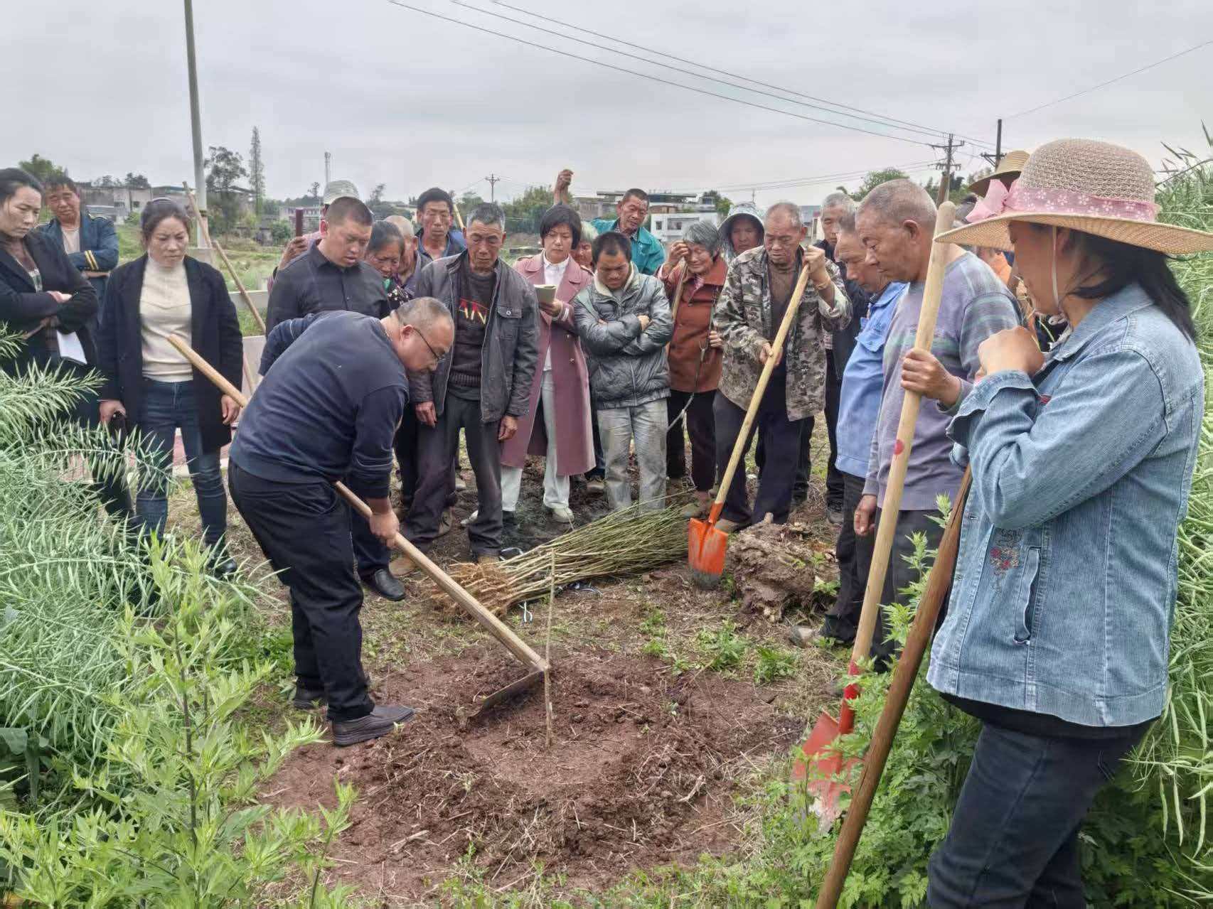 在泸县毗卢镇白合村,银登贵老师就2026年引进示范的鲜食桃和观赏桃的品种特性分别进行讲解,并现场示范“五个一”栽植技术要点(一株好苗子,一个定植穴,一袋有机肥,一桶定根水,一张覆地膜)。随后,银登贵还根据马溪河沿岸缺肥、湿热等环境特点,提出了近期农事管理方案。本次现场指导和培训,是落实《毗卢镇农业产业规划(2026-2030)》,建设马溪河沿岸十里桃花长廊的重要举措,将为毗卢镇打造成渝毗邻区花果之乡提供重要示范样板。