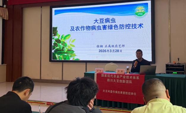 3月28日下午,省大豆创新团队大豆间套作病虫草害防控岗位专家受邀对成都市组织的2026年农药经营许可培训会近50名农药经营人员开展了大豆病虫及农作物病虫害绿色防控技术培训。