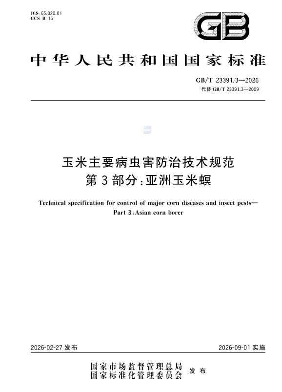 国家质量监督检验检疫总局和国家标准化管理委员会2026年2月27日发布,《玉米主要病虫害防治技术规范 第3部分:亚洲玉米螟》推荐性国家标准即将于2026年9月1日起实施。我省大豆创新团队大豆间套作病虫草害防控岗位专家徐翔正高级农艺师参与修订该项国家标准。